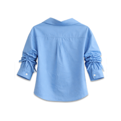 Long Sleeve Blouse with Ruched Sleeves and Ribbons - Light Blue