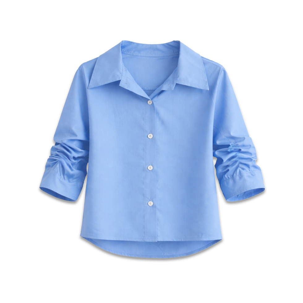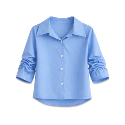 デザインスリーブが主役!爽やかブルーの甘辛ブラウス