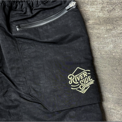 オリジナル刺繍ロゴ入りのナイロンパンツ。