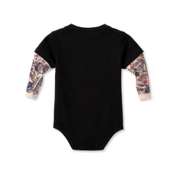 シンプルなボディに、ハードでクールなフェイクタトゥーデザインの袖を組み合わせたロンパースです。